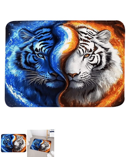 Tapis de Bain Antidérapant motif Tigre Animal Yin et Yang 100% polyester, antidérapant, lavable, décoration de salle de bain design. 61 x 43 cm.