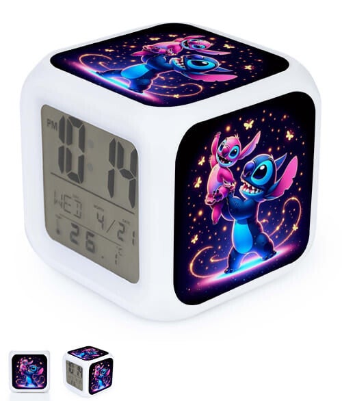 Ce petit réveil a la forme d'un cube et a un design noir et rose cool avec Stitch. Il mesure environ 7,6 cm de côté (7,8 x 7,8 x 7,8 cm pour être exact), donc il ne prendra pas trop de place sur votre table de chevet. Ce qui est bien, c'est que vous pouvez le régler pour vous réveiller avec différents sons. C'est une façon amusante et simple de commencer votre journée.